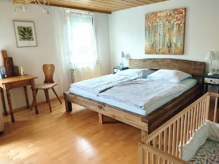 Geräumiges Schlafzimmer für 2 Personen (Doppelbett 180×200 cm) – und ein zusätzliches Kinder-Gitterbett