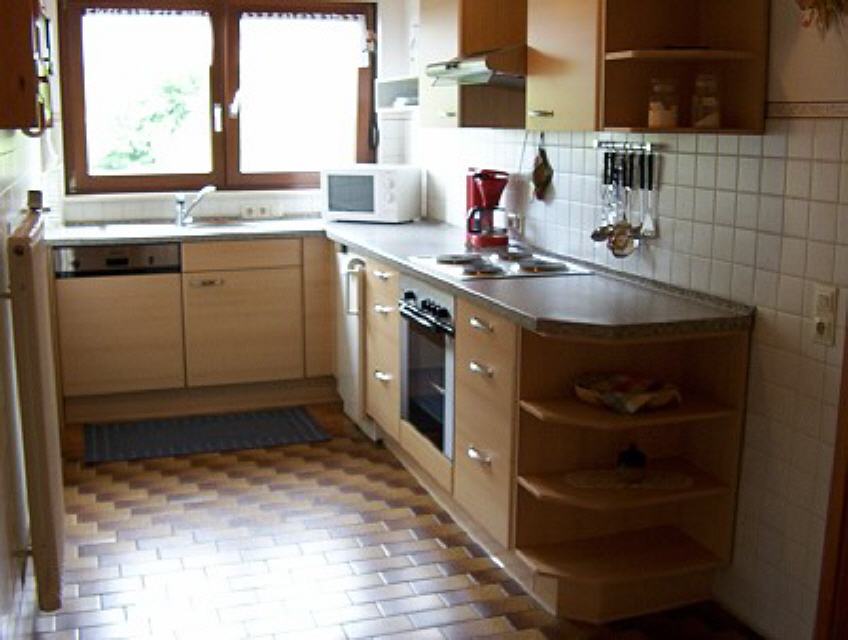 Küche komplett ausgestattet mit Kaffeemaschine, Wasserkocher, Toaster, Backofen, Kühlschrank mit Gefrierfach