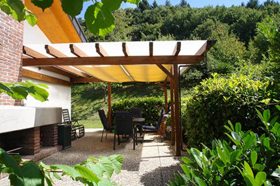 Genießen Sie die Hanglage in der obersten Häuserreihe und den parkähnlichen Garten drumherum. Die Fewo bietet für 2 bis max. 3 Personen ein großzügig verglastes Wohnzimmer (Studiostyling) mit Balkon, ausgestattet mit 127 cm-Farb-Sat-TV (ca. 500 Prog.), Internetradio mit tausenden von Sendern (weltweit) sowie einer ausziehbaren, sehr komfortablen Couchgarnitur. Das gemütlich eingerichtete Esszimmer ist mit dem Wohnzimmer verbunden und lässt eine sehr angenehme Wohnatmosphäre entstehen. Die exklusive Einbauküche ist mit modernster Technik wie Cerankochfeld, Mikrowelle und Geschirrspüler, ausgestattet. Auch das Badezimmer, das mit Dusche und Badewanne ausgestattet ist, verfügt, wie die Küche über modernste Technik, d.h. Thermostatarmaturen sind natürlich selbstverständlich. Eine Waschmaschine steht bereit. Das Schlafzimmer besteht aus gebürstetem Massivholz, einschließlich modernsten Holzlattenrosten. Bei Bedarf ist ein zusätzliches Gästebett verfügbar. Möbelsafe. Diese Wohnung verfügt nicht nur über einen Balkon, sondern auch über eine große Terrasse mit offenem Kamin und überdachter Pergola. Genießen Sie das Grillen am offenen Kamin in der obersten Häuserreihe mit Blick über das Tal.
