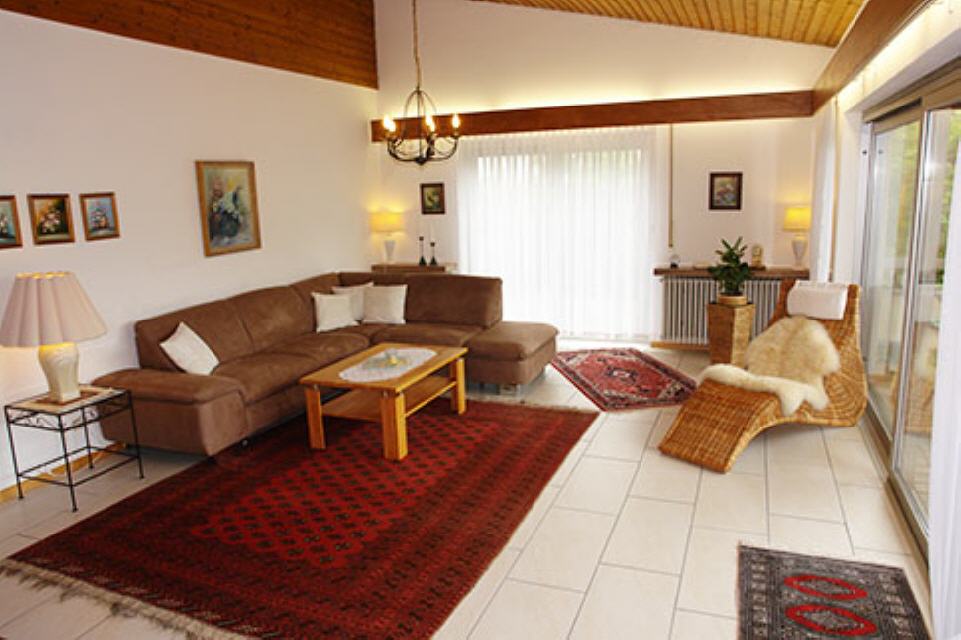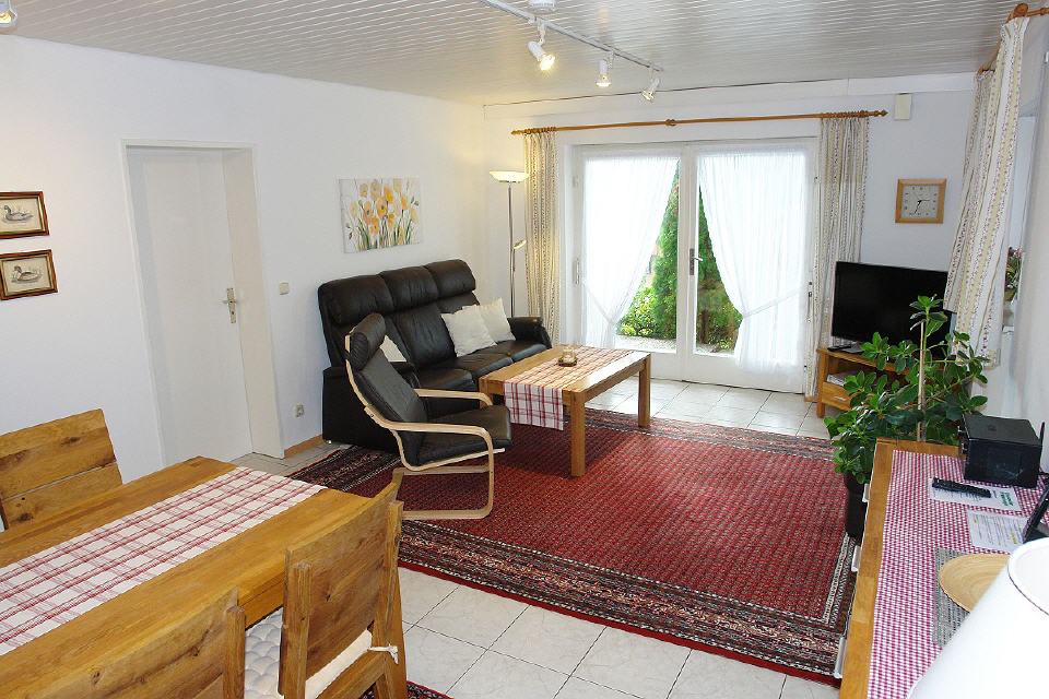 exklusiv und geschmackvoll eingerichtete Ferienwohnung für 1 bis 3 Pers., Wohnfläche ca. 50 qm; Wohnzimmer mit großem 107 cm-Flachbild-HD-Sat-TV (ca. 500 Programme), Internet-Radio (mit tausenden von Sendern), Möbelsafe, ausziehbare, sehr komfortable Ledercouchgarnitur mit elektrisch verstellbarem Fernsehsessel sowie integrierte, luxuriöse Küchenzeile mit modernster Technik und Kaffeeautomat, Schlafzimmer für 2 Pers. sowie zusätzlich ausziehbare Couchgarnitur im Wohnzimmer, Badezimmer mit Dusche (Thermostatarmatur) und Badewanne, separat. WC, Terrasse mit Gartenmöbeln und Sonnenliege, Wohnung im Erdgeschoss in exklusiver sonniger Hanglage.