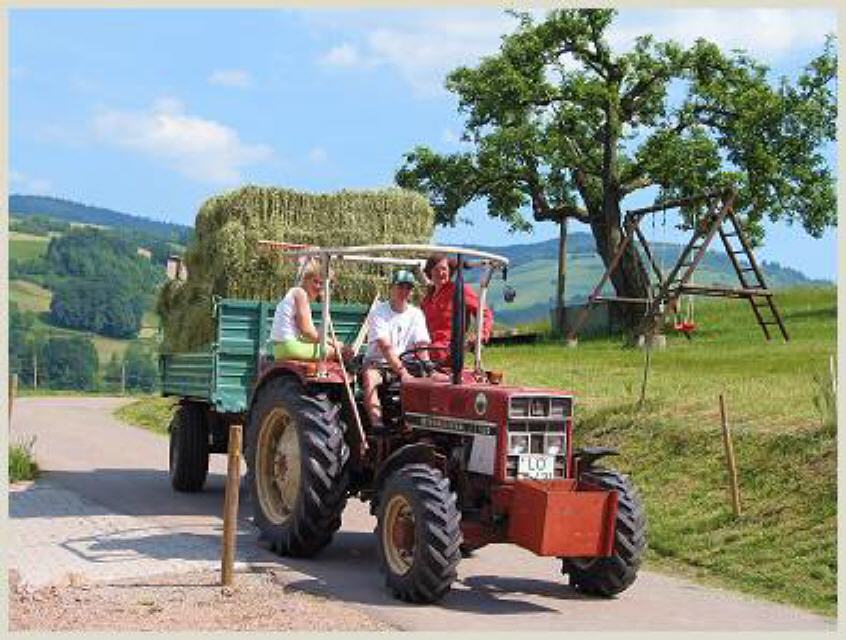 Unser Hof, den wir mit großem Engagement und viel Zeitaufwand extensiv bewirtschaften, verbindet das Neue mit bewährter bäuerlicher Tradition des Wiesentales. Als Kleinstbetrieb beschränken wir uns auf die Haltung von etwas Milchvieh und die Aufzucht von Jungvieh. Wir sind einer der Zuchtbetriebe für das “Hinterwälder Rind” im Wiesental und beteiligen uns damit aktiv an der Erhaltung dieser vom Aussterben bedrohten zierlichsten europäischen Rinderrasse. Die Äpfel unserer Streuobstwiese verarbeiten wir selbst zu Apfelsaft und Obstschnaps. “Urlaub auf dem Bauernhof” heißt bei uns, dass Sie uns, die Familie Bauer, beim Alltag auf dem Hof so erleben können, wie Tier und Natur es erfordern. Unser Kuhstall ist kein Streichelzoo, aber wer mag, darf gerne mit uns die sehr sanftmütigen Hinterwälder morgens auf die Weide treiben und abends zurückholen. Der Einsatz von Maschinen auf einem modernen Hof schränkt die Mithilfe williger Laienhände ein, bei der herbstlichen Apfelernte jedoch ist jede helfende Hand willkommen.